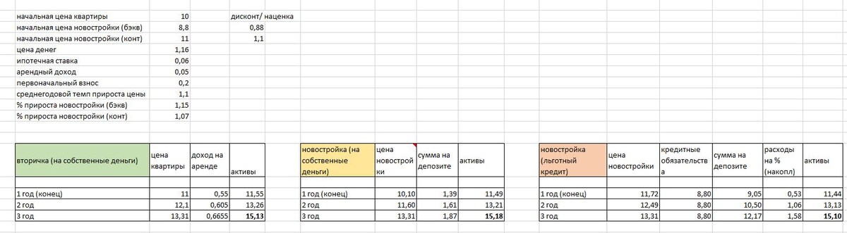 Цель - выяснить уровень дисконта (наценки) на новостройки относительно вторички, который выравнивал бы все три варианта, используя «метод активов».