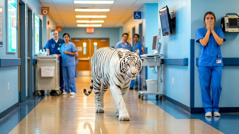 В тот утренний час больница дышала привычной будничной суетой — пока коридоры не разорвал резкий крик и топот десятков ног. Я поднял голову от карты пациента и даже не сразу поверил собственным глазам. Посреди холла стоял огромный белый тигр. Точнее — тигрица. В пасти у неё аккуратно, почти трепетно лежал крошечный белый тигрёнок. Люди метались, прятались, закрывали двери, но сам хищник оставался неподвижным, будто высматривал единственного, кто сможет понять, зачем он пришёл. Когда ворвались полицейские с оружием, воздух натянулся, как струна. Одно неверное движение — и трагедия была бы неизбежной. Но тигрица даже не рычала. Она будто ждала. И в тот момент я понял: ей нужна помощь. 👉 Что произошло дальше — смотрите в этом видео: Когда я приблизился к тигрице, она осторожно положила тигрёнка на пол и отступила, сохраняя на мне тревожный, но доверчивый взгляд. Это был взгляд матери, готовой на всё ради своего детёныша. Тигрёнок был в ужасающем состоянии — обезвоженный, горячий, едва ш