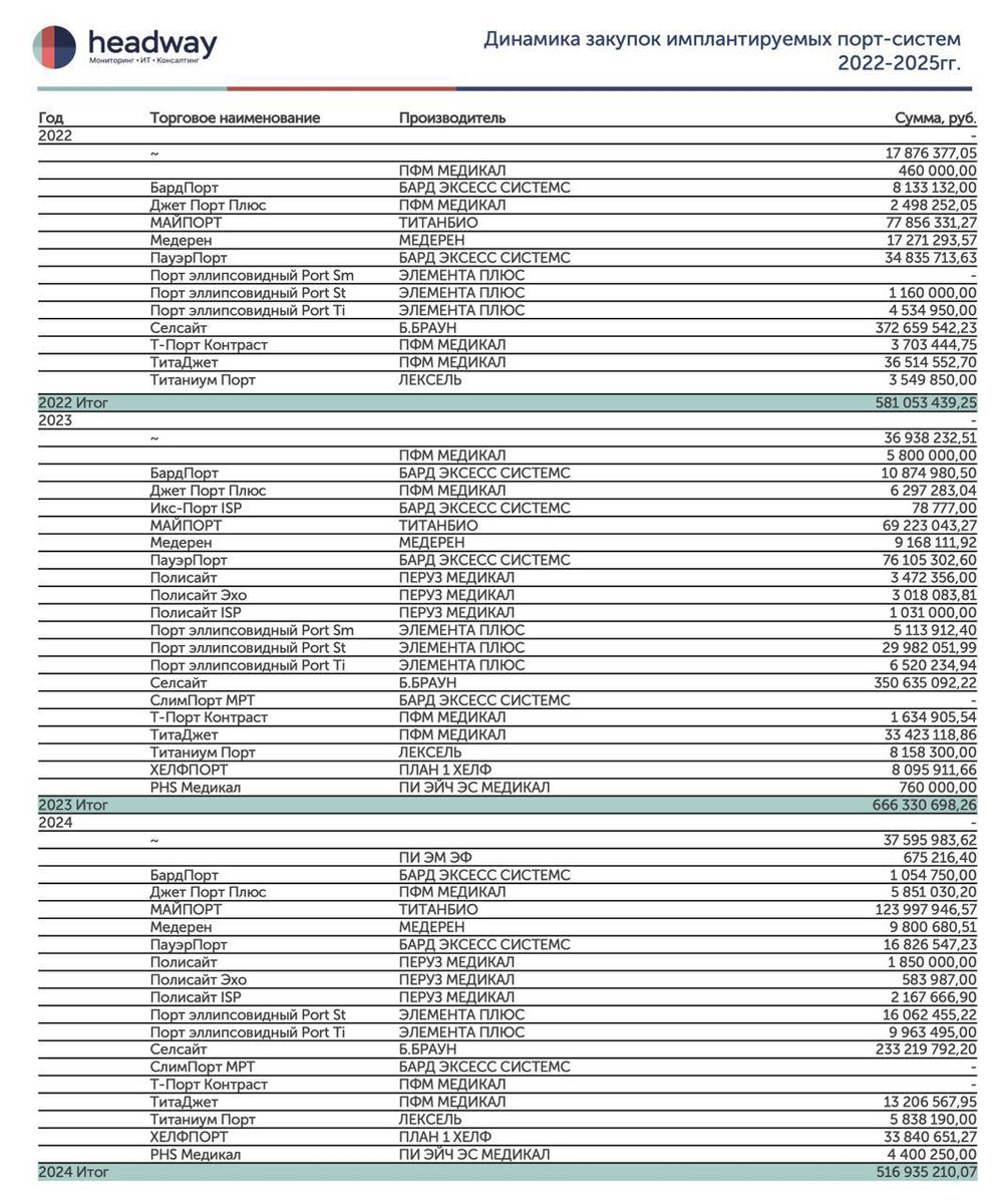А вы знали, что в систему Headway вносится тип продукции имплантируемые порт-системы? Имплантируемые порт-системы — это медицинские устройства длительного доступа к сосудистому руслу, широко применяемые в онкологии, гематологии, интенсивной терапии и при проведении длительных инфузий. Основное преимущество порт-систем заключается в снижении риска инфекций, комфорте для пациента и возможности многократного использования без повторных венепункций. Рынок и производители 🏭 Российский рынок имплантируемых порт-систем представлен как зарубежными, так и отечественными производителями. Наиболее заметны бренды компаний ПФМ Медикал, Бард Эксесс Системс, ТитанБио, Перуз Медикал, Элемента Плюс, Б. Браун и др. Ассортимент включает как классические порты, так и специализированные решения (МРТ-совместимые, низкопрофильные, полиуретановые и титановые системы). Динамика закупок 2022–2025гг. 📈 Анализ закупок за 2022–2025 годы показывает, что рынок сохраняет высокий и относительно стабильный объём. 🔴