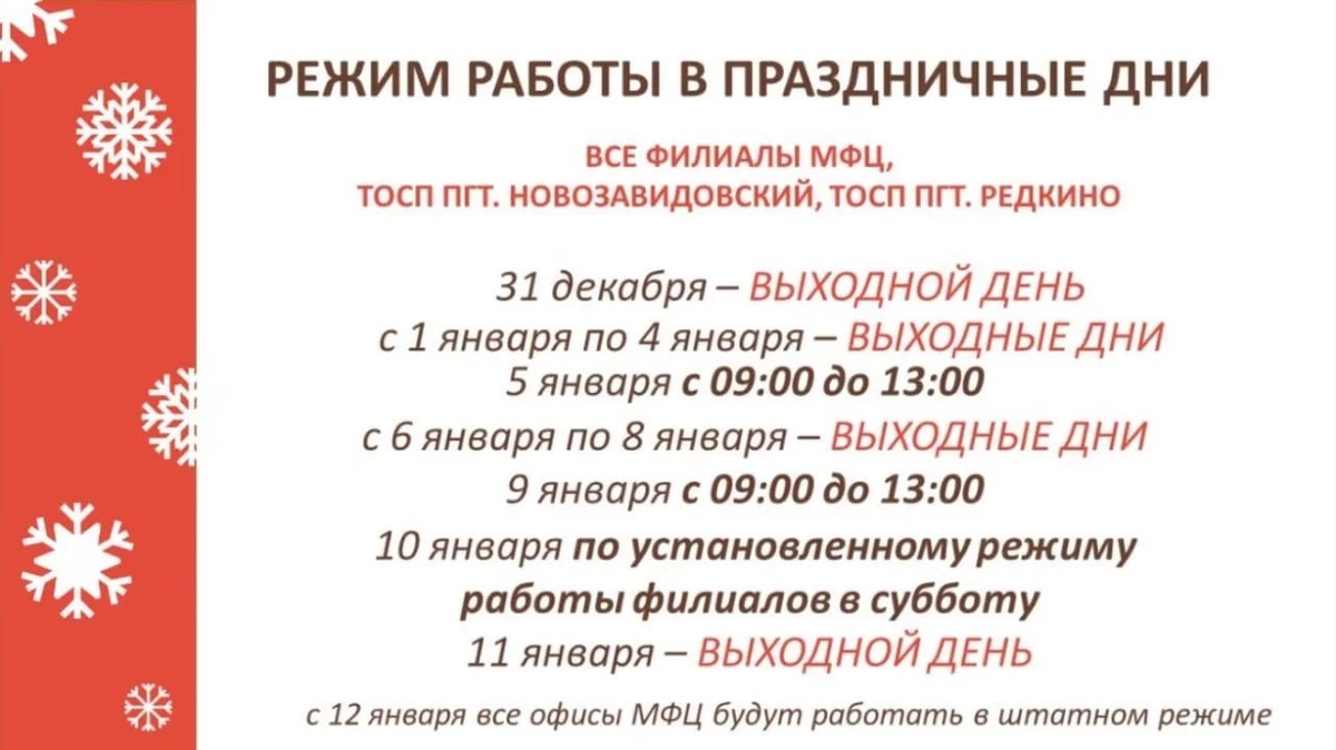 Для удобства граждан работа филиалов МФЦ, а также территориально обособленных структурных подразделений МФЦ «Мои документы» в поселках Новозавидовский и Редкино Конаковского округа будет организована: · 5 января с 9:00 до 13:00, · 9 января с 9:00 до 13:00, · 10 января – по установленному режиму работы филиалов в субботу. Все остальные дни – выходные (31 декабря, 1, 2, 3, 4, 6, 7, 8 и 11 января). В 2025 году исполнилось 15 лет со дня образования ГАУ Тверской области «Многофункциональный центр предоставления государственных и муниципальных услуг». Сеть МФЦ охватывает все муниципалитеты Верхневолжья. За год было принято более 1,5 млн обращений граждан, обработано свыше 130 тыс. звонков, организовано предоставление 13 новых услуг, включая меры поддержки участников СВО и членов их семей. Чат-бот МФЦ функционирует в МАХ. Подписаться на «Тверская область. Официально» в МАХ