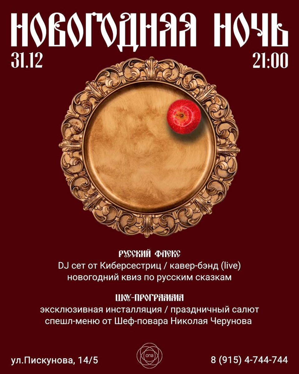 31 декабря ona приглашает встретить Новый год с русской эстетикой, современной музыкой и сказочной атмосферой. Насыщенная программа в новогоднюю ночь 🙌🏼 Сбор гостей 20:00 ул.Пискунова, 14/5 8 (915) 4-744-744