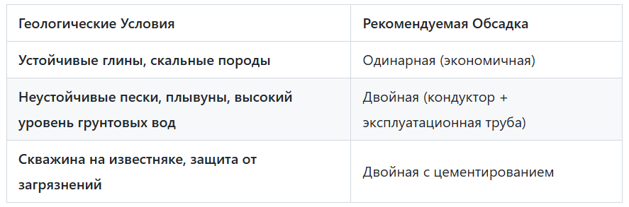 При бурении скважины на воду, особенно на песок или известняк, инженеры принимают ключевое решение относительно обсадной колонны. Существует два основных подхода: одинарная обсадка и двойная обсадка (кондуктор). Выбор конструкции напрямую влияет на стоимость бурения, срок службы скважины, её водоотдачу и устойчивость к обрушениям. Это самый простой и распространённый метод, используемый в регионах со стабильными геологическими условиями. В скважину устанавливается одна труба, которая проходит через все проходимые слои грунта до водоносного горизонта. Двойная обсадка предполагает использование двух труб разного диаметра, вставленных одна в другую. Этот метод обязателен в сложных геологических условиях. Пространство между кондуктором и эксплуатационной колонной (кольцевой зазор) цементируется или заполняется глиняным раствором. Выбор между одинарной и двойной обсадкой — это, прежде всего, ответ на вопрос о геологии. Важное примечание для скважин на песок Даже если вы используете одинарн