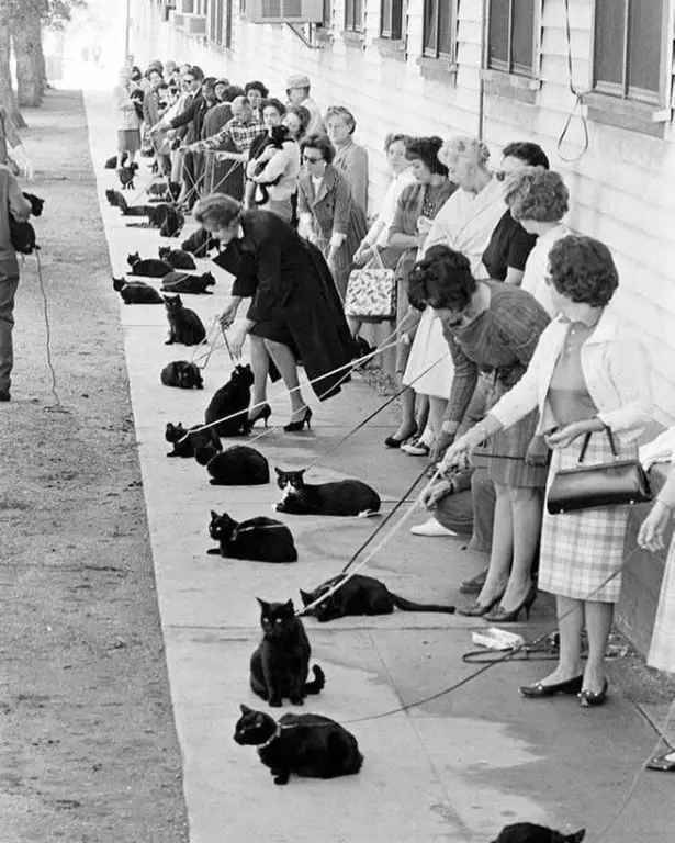 В интернете иногда попадаются снимки, которые выглядят как начало анекдота: толпа людей, у каждого на руках кот, и почти все — угольно-чёрные. Первое ощущение: либо клуб любителей “мистики”, либо собрание, куда случайно пустили только тех, кто пришёл с пушистым пропуском. А правда оказалась куда забавнее и кинематографичнее. Это не секта, не флешмоб и не странный праздник. Это кастинг. Самый настоящий. Просто кастинг… чёрных котов для фильма. На этих фото люди стоят плечом к плечу, держат питомцев и явно чего-то ждут. У кого-то кот сидит гордо, как звезда красной дорожки. У кого-то пытается стать невидимкой и вжаться в локоть хозяина. А у кого-то уже по взгляду видно: “Я вообще-то дома должен был спать”. И в этом прелесть кадра: люди здесь серьёзные, а ситуация — слегка абсурдная. Редкий случай, когда взрослые добровольно приходят “на пробы”, но всё внимание получают не они. События относят к 1961 году, когда снимали фильм по рассказам Эдгара Алана По. Одна из историй называлась “Чёрны