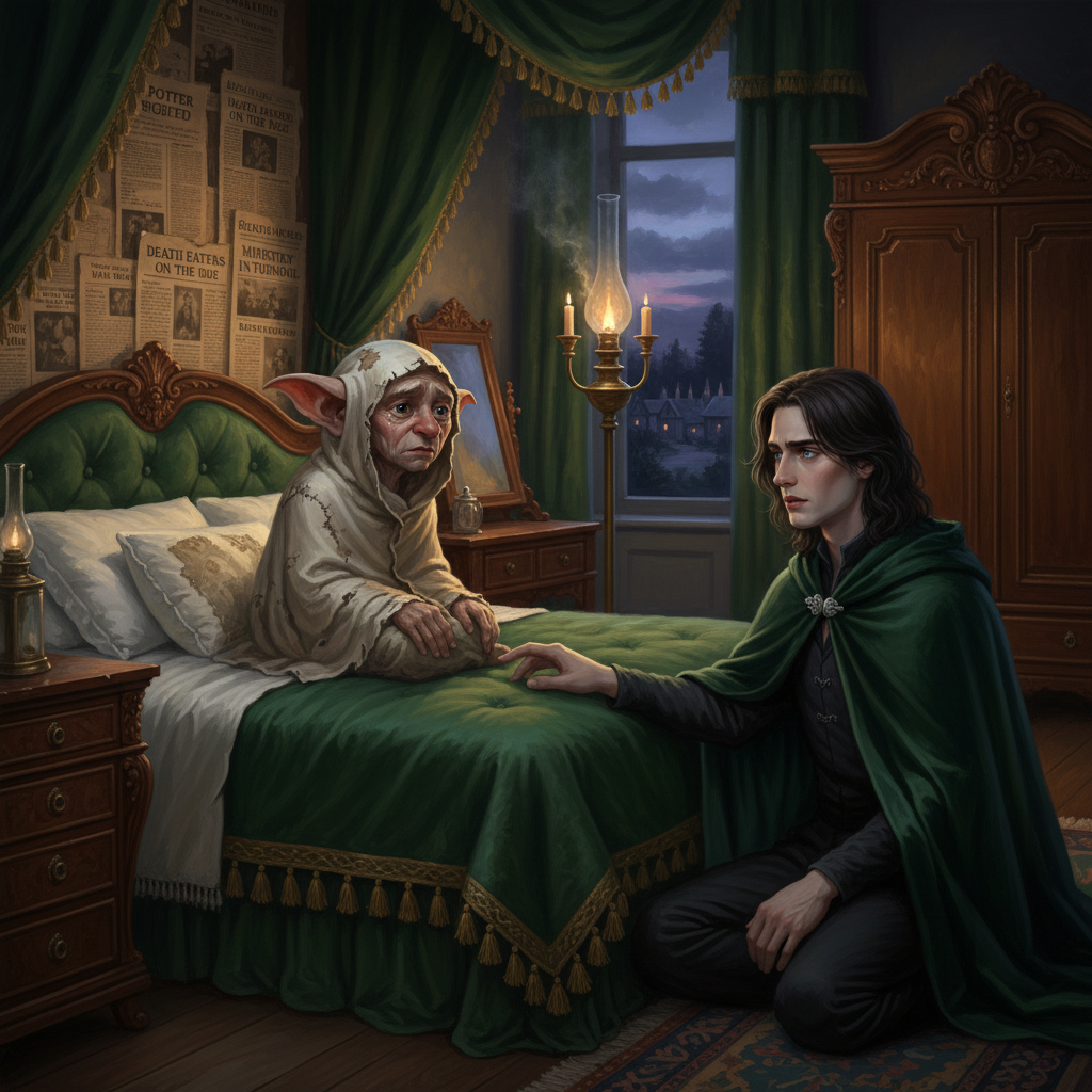 Кикимер сидел в своей коморке и тихо напевал под нос, чистя чашу. Запах средства заполнил всё, но эльф этого не замечал. Раздался тихий треск, и напротив коморки оказался хозяин — Регулус. Лицо его было бледным и уставшим, но в глазах было что-то близкое к безумию или агонии, которую Кикимер испытал сам. Чаша выпала и покатилась в сторону.