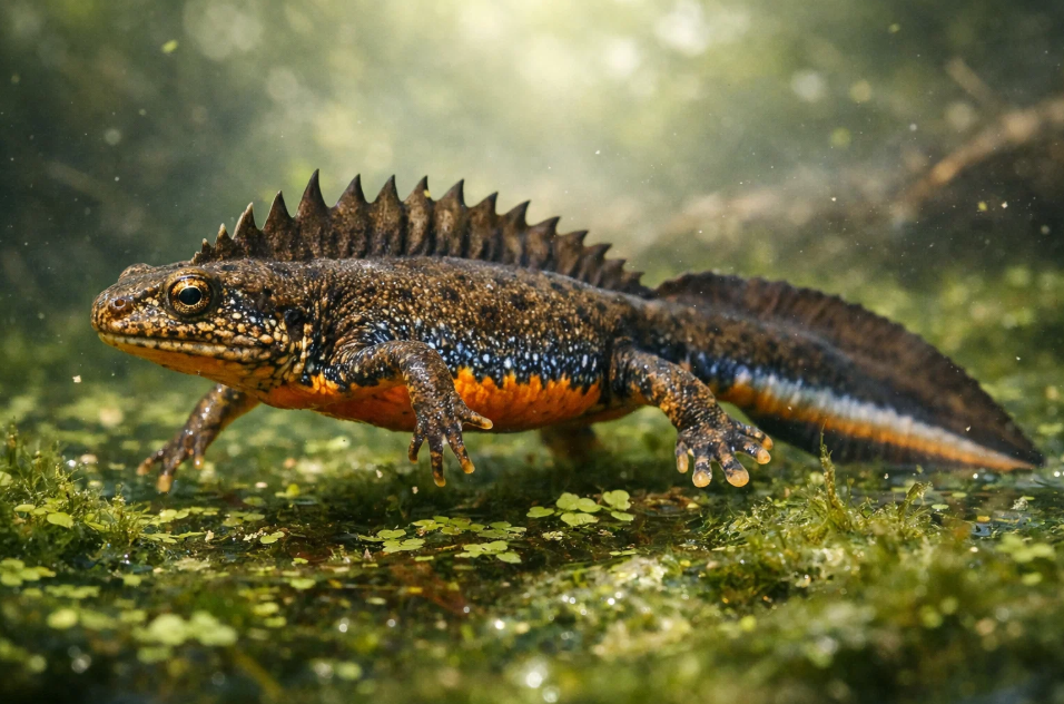 Тритон снова меняется на глазах, и эти изменения носят обратимый, сезонный характер. Его кожа, бывшая сухой и зернистой, становится гладкой и слизистой, облегчая газообмен в воде и уменьшая сопротивление при плавании. Но самые поразительные перемены касаются внешности. У самцов вырастает великолепный, высокий зазубренный гребень, идущий непрерывной волной от головы до кончика хвоста. Этот гребень — не просто украшение; он богат кровеносными сосудами и служит дополнительным органом дыхания в бедной кислородом воде, а также плавником, придающим стремительность и маневренность. Окраска тела становится невероятно яркой: на оливково-коричневом фоне проступают ярко-оранжевые пятна на брюхе и синие переливы по бокам. Хвост удлиняется, а на пальцах задних лап появляются лопастные оторочки — своеобразные плавательные перепонки.