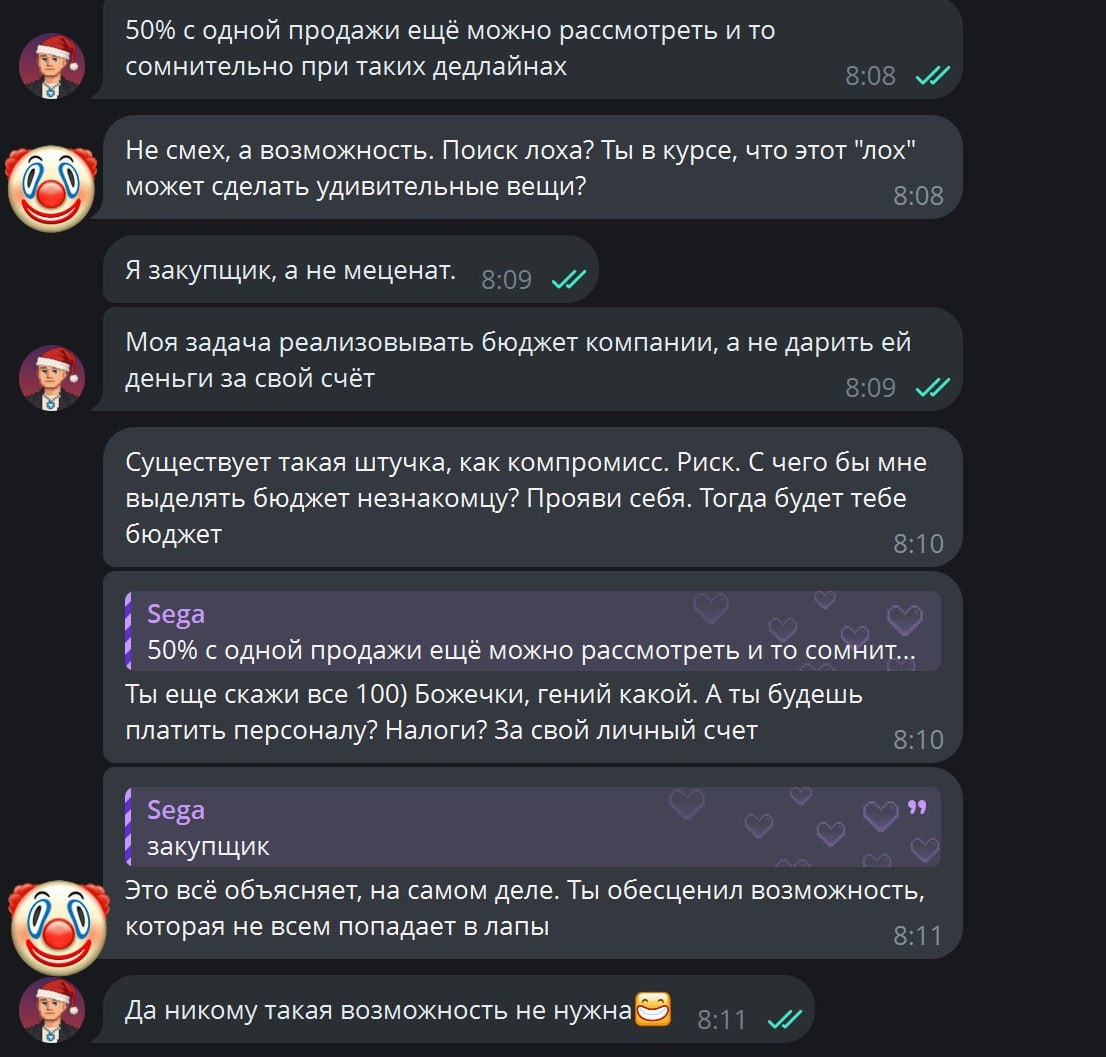 » 💀 Утро 26 декабря. Влетает «золотое предложение»: — гони трафик на отель в Крыму с чеком 100к+ на праздники — получаешь 3к за одного постояльца — весь трафик, тесты, риски — за твой счёт, естественно И это выдают как «крутую возможность». Почему такие «офферы» надо отсекать сразу: — весь риск на тебе, вся маржа — у них — никакого предоплаты, никакой гарантии загрузки — по факту ты бесплатный отдел маркетинга, который ещё и платит за свою работу Я человеку спокойно объяснил, что так работа не делается и пусть ищет другого. В ответ — классика жанра: «закупщик для непонятных компаний», «недоблогер» и прочая детская обида. Диалог, конечно, потом был благополучно удалён. Вывод для нас с тобой: — если тебе предлагают схему, где ты только платишь, а тебе «возможно что-то перепадёт» — это не партнёрство — нормальный бизнес делит риски и прибыль, а не сваливает всё на исполнителя — чем ближе Новый год, тем больше вот таких «крутейших возможностей» прилетает — фильтруй жёстче обычного