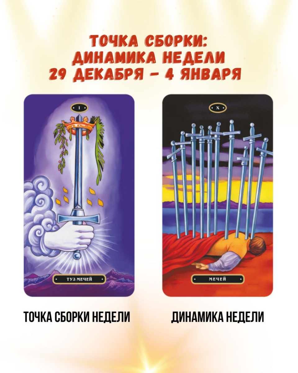 🔘🔘🔘🔘🔘 🔘🔘🔘🔘🔘🔘: ДИНАМИКА НЕДЕЛИ 1⃣ ТОЧКА СБОРКИ НЕДЕЛИ — Туз Мечей Внутренний центр недели — резкость, ясность, трезвость ума. Туз Мечей даёт состояние, когда ты внезапно всё видишь без пелены, без иллюзий, без попыток смягчить углы. Это честность с собой, с другими, с ситуациями. Это энергия: 💕ясности и честности с собой 💕внутреннего решения «так больше не будет» 💕ментального прорыва 💕расстановки границ 💕нового взгляда на старые ситуации. Энергетическое состояние: «Я вижу. Я понимаю. Я выбираю ясно» Это правильная внутренняя установка для перехода между годами — когда важно назвать вещи своими именами и перестать терпеть лишнее. 2⃣ ДИНАМИКА НЕДЕЛИ — 10 Мечей Эта карта здесь — не трагедия, а завершение цикла, который нужно закрыть давно. Причём завершение не мягкое, а окончательное, без возможности возврата. То, что болело, устало, тянулось — уходит. Не потому, что кто-то забрал, а потому что ты отпускаешь. Это неделя эмоциональной и ментальной разгрузки. Ты пер