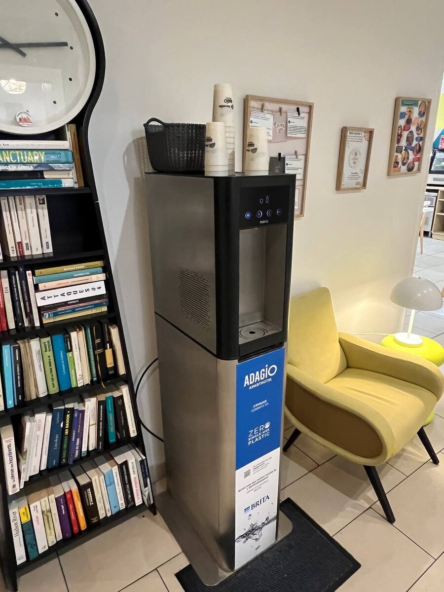 Когда в гостинице есть посудомоечная машина, то уже не остается оправданий использовать одноразовую посуду :) Рассматриваем на примере гостиницы Adagio из Франции. Хотя важно сказать, что все отели сети Accor в мире успешно побеждают мусор :) Но во Франции им еще помогает закон "О нуле отходов". Что мы видим на фото: чистая посуда стоит стопочками, использованная складывается в корзинку. Моется при температуре 60 градусов и выставляется обратно :) А рядом с кулером еще полка книгообмена стоит ;)