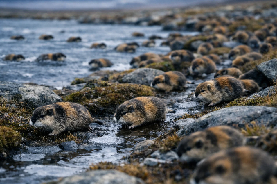 В это время лемминги действительно проявляют необычайную смелость (или безрассудство с нашей точки зрения). Они переплывают широкие реки и озера, пересекают дороги, заходят в человеческие поселения. Их поведение меняется: гормоны стресса делают их более агрессивными и менее осторожными. Именно эти наблюдения, сделанные в разгар миграции, и породили миф о массовом суициде. Животное, загнанное в угол, может броситься на человека или хищника. Атакованное стаей птиц, оно может бежать, не разбирая дороги.
