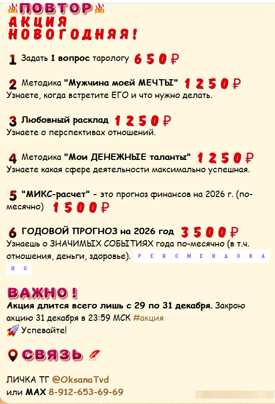 - 🟢🔴 Особенно хочу порекомендовать вам годовой прогноз на 2026 год. Вы получите подробный разбор важных аспектов жизни — от отношений и здоровья до финансов и общих тенденций — с разбивкой по месяцам. Это поможет вам лучше ориентироваться в событиях грядущего года и принимать взвешенные решения!