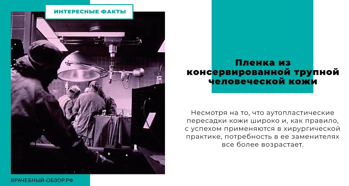 В 1961 году А. Ф. Бродский из киевской лаборатории консервирования тканей описывает материал, звучащий почти провокационно: плёнку, изготовленную из консервированной трупной человеческой кожи. На фоне привычной аутодермопластики это выглядит как шаг в сторону — ведь «своя» кожа остаётся единственным вариантом, который действительно становится частью пациента. Но Бродский пишет не из теории. Он пишет из практики, где у хирурга иногда нет права ждать идеальных условий: ожоги, скальпированные раны, обширные раневые поверхности, когда донорских площадей не хватает, а рану нужно прикрыть хотя бы временно. Ключевое напряжение текста — между мечтой о «истинном приживлении» и реальностью временного спасения. Бродский формулирует это трезво: гомокожа «истинно» не приживает, но её роль огромна — она даёт ране укрытие и организму паузу. И если трансплантат всё равно обречён на отторжение, зачем беречь его анатомию как святыню? Автор предлагает дерзкий ход: не лоскут, а материя. Кожу измельчают,