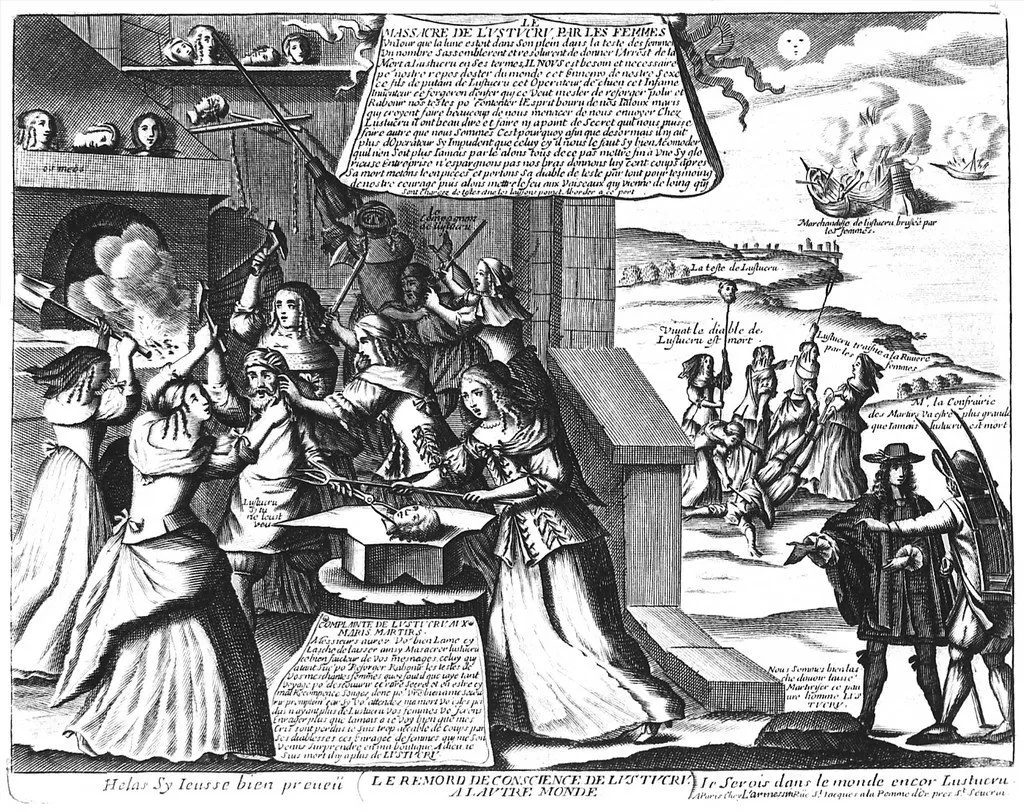 Люстюкрю был героем лубочных картинок и площадных фарсов. Обычно его изображали кузнецом, который (внимание, сейчас будет немного сексизма из XVII века) предлагал «перековать» головы капризных женщин, чтобы излечить их от вздорности. В общем, персонаж был комичный, нелепый и, скажем прямо, недалекий.