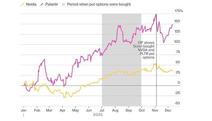 Обнаружение этой сделки было рутинным делом, но эффект — взрывным. 3 ноября стало известно, что фонд Scion Asset Management держит защитные пут-опционы на акции Nvidia и Palantir — компаний, находящихся в центре ИИ-бума. За фондом стоит Майкл Бьюрри, предсказавший кризис 2008 года и ставший героем «Игры на понижение». Его ставка против лидеров рынка подействовала как зажженная спичка на кучу сухого хвороста — скептицизм по поводу завышенных оценок в ИИ-секторе нарастал давно. Акции Nvidia и Palantir отреагировали падением. Пока не понятно, окаежтся ли эта сделка пророческой или преждевременной, но она показала, как быстро могут рухнуть даже самые доминирующие рыночные тренды.