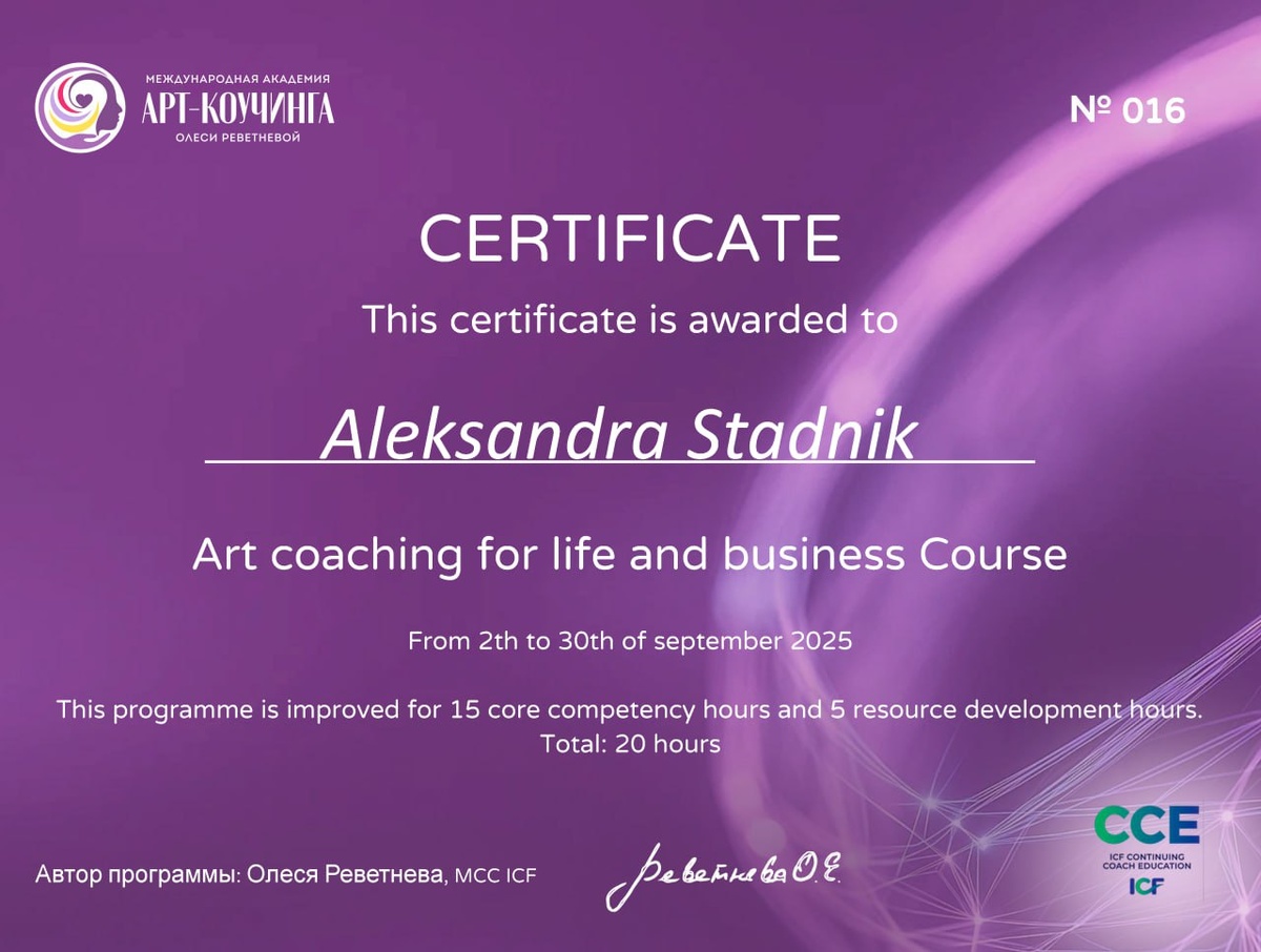 В сентябре проходила курс, но он успел пройти аккредитацию в ICF и нужно было пройти дополнительный материал. Успела завершить всё до конца 2025 года, и ко мне прилетел сертификат. Что такое арт-коучинг? Арт-коучинг — это метод коучинга, который сочетает классические техники с творческими практиками, такими как рисование, лепка или работа с метафорическими картами, чтобы помочь человеку глубже понять себя и достичь целей. Он возник на стыке коучинга и арт-терапии, позволяя обходить вербальные барьеры и подключать подсознание через искусство. Основные принципы В арт-коучинге коуч задает вопросы, а клиент выражает мысли и эмоции через творчество, что помогает выявить скрытые блоки, страхи и ресурсы. Это не терапия прошлого, а фокус на будущем: постановка целей, мотивация и поиск путей реализации. Преимущества Метод расслабляет, снимает напряжение и раскрывает творческий потенциал, делая процесс интересным и эффективным для личностного роста или карьеры. Подходит для проработки эмоций,