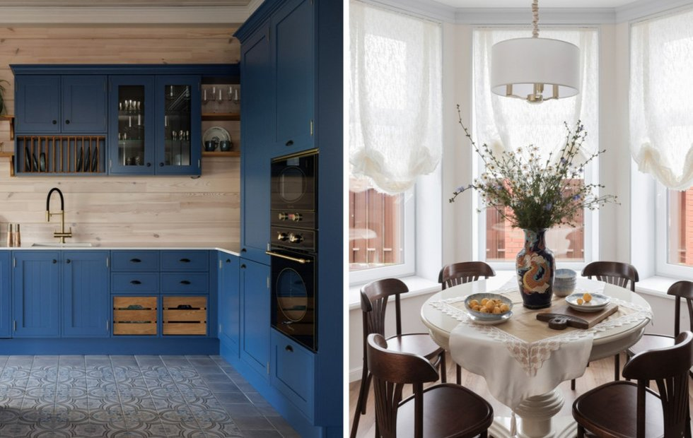 Дизайнер Лилия Ханова создала в этом доме для семьи из трех человек атмосферу покоя и безмятежности, где можно отдохнуть от городской суеты. Благородный синий, отражающий характер хозяев, лег в основу цветовой концепции интерьера. Особое место занимает обеденная зона в светлом эркере с круглым столом и венскими стульями, хранящими воспоминания о бабушке заказчика. Текстиль играет ключевую роль в создании гармонии: французские шторы на кухне — смелый акцент, а ткани и светильники в гостиной перекликаются. Фреска, шторы и кухонный остров выдержаны в единой цветовой гамме. Легкий узор листвы на фреске в зоне ТВ перекликается с изгибом перил лестницы, привнося в интерьер изысканность.