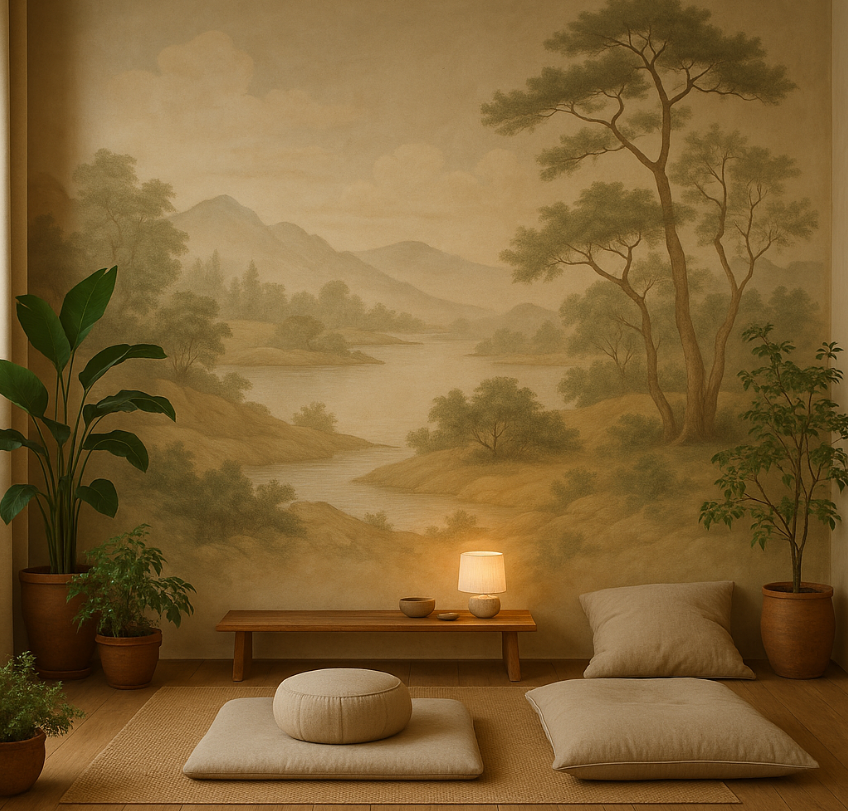 — Фреска в медитативной зоне должна помогать снизить активность ума: уводить от деталей, давать опору для взгляда и служить «визуальным якорем» для практики. Сначала формулируйте состояние — успокоение, сосредоточение, открытое присутствие — а уже потом выбирайте сюжет и палитру. 2. Палитра — минимализм и мягкость