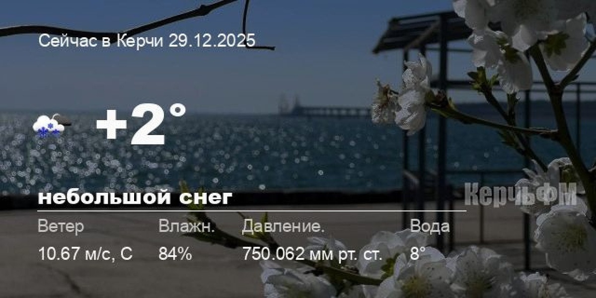 Сегодня днем в Керчи, 29 декабря, ожидается снегопад, температура воздуха от +0.5° до +2°С, ветер северный 10.79 м/с, порывы до 11.14 м/с, давление 750.8 мм рт. ст., влажность 80%. Ближайшей ночью ожидается снегопад, температура +1.4°С. Завтра, 30 декабря, в течение суток ожидается пасмурная погода; ночью +1.4°С, днем +1.4°С, ветер северный 3.82 м/с. - Феодосия от +0.1° до +1.5°С, ☁️ пасмурно, море: 4°C - Судак от -1.6° до -0... подробнее Подписывайся на КерчьФМ.РФ @kerchfm