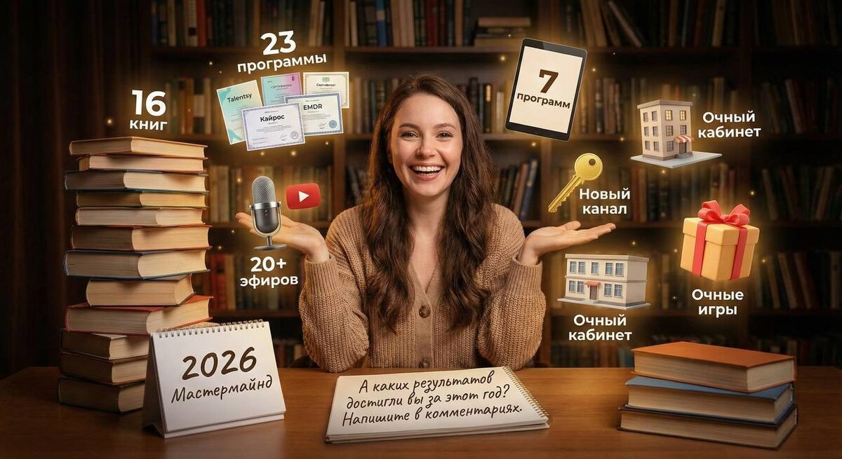 ☺️☺️☺️☺️ 💜 Прочитано 16 книг. Признаюсь честно, порядка 7 книг еще начаты и не дочитаны 🫣 💜 Прошла 28 обучающих программы, 2 конференции в Talentsy, 1 конференцию Кайрос. На данный момент прохожу годовую программу в Talentsy, в марте завершаю. И зашла на курс EMDR, в январе-феврале завершаю. Прошла обучение по проведению Мастермайндов. Поэтому в 2026 году буду собирать группы. Первый поток - по выгодным условиям. 💜 Создала 7 программ для вас в этом году. И о новогодних скидках расскажу позже. 💜 Я провела 10 эфиров на разные темы у себя на канале, и более 10 эфиров с интервизиями и практиками в Пространстве для психологов. 💜 В этом году я создала еще один канал с более глубокими практиками и своими артефактами. Напишите мне в личные сообщения и я отправлю ссылку на этот канал. 💜 В этом году я вышла на очный формат консультирования и групповых работ. Кабинет находится в центре города. Для записи пишите в личные сообщения. 💜 И я уже попробовала очный формат участия в игре,