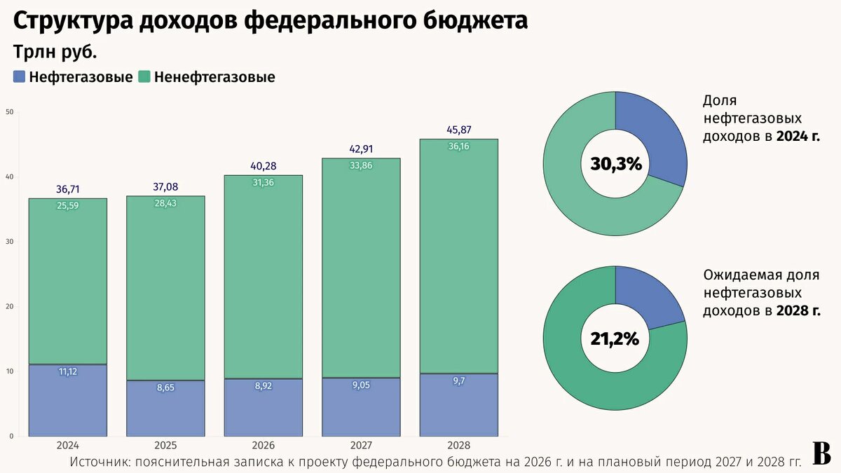 Смотрите, плановые нефтегазовые доходы на 2026 год - 8,92 трлн рублей, а на 2025 - 8,65 трлн. На протяжении всего 2025 года конъюнктура для российской нефти планомерно ухудшалась: в первом квартале она была еще приемлемой, во втором-третьем - стала заметно хуже, а в четвертом - просто вообще испортилась (экспортные цены упали ниже 40 долларов за баррель, дисконты превышали 40%).