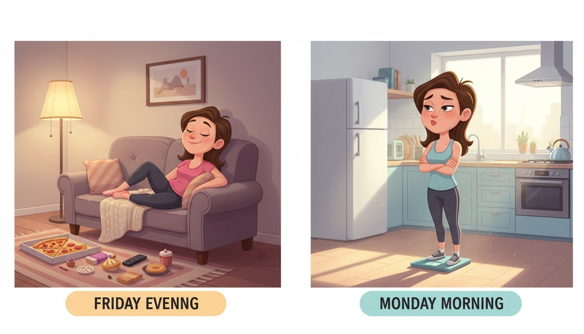 Если вы ловили себя на мысли, что худеете «рывками», а каждый понедельник начинается как день сурка — вы не одни. Вы стараетесь, держитесь, следуете плану… но выходные снова всё перечёркивают. Эта статья — не про силу воли и не про запреты. Она про то, почему так происходит на самом деле и как перестать начинать заново, а начать наконец двигаться стабильно. Пятница вечер. Рабочая неделя позади, холодильник зовёт, и где-то в голове звучит знакомое: «ну я же заслужила». Пицца, сериал, бокал вина — вроде мелочи. Но к субботе режим уже расслабленный, к вечеру воскресенья — торт у подруги, и стрелка весов снова ползёт вверх. В понедельник утро начинается с лёгкого шока. На прошлой неделе всё шло хорошо, а за два дня вес вернулся, будто насмехаясь. Настроение падает, появляется вина и мысль: «всё зря». И снова обещание себе — с этого понедельника точно начну.