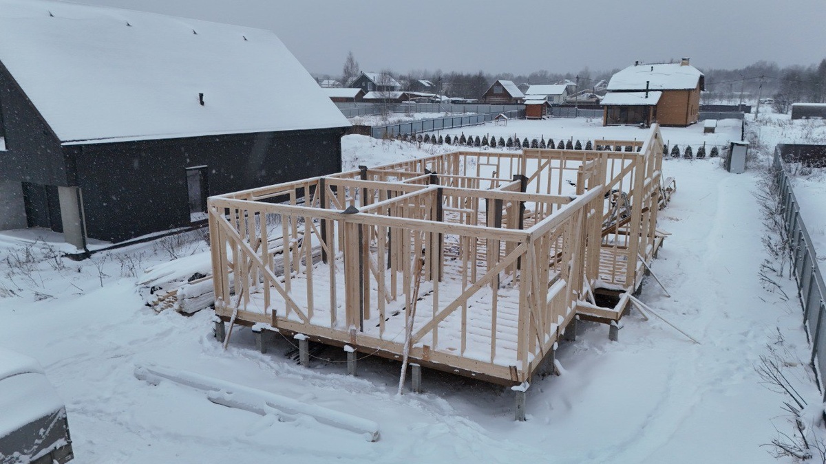 Полным ходом идет строительство одноэтажного каркасного дома проект Архангельск. Завершается монтаж стен силового каркаса , используется сухая строганная доска 45х140 и 45х190 Строительство ведется по Семейной ипотеке от Сбербенка. Нас , наши проекты , стоимость можно найти на портале Дом клик по ИНН Подрядчика - 290500023489 Наш сайт www.Biznes-stroi.ru