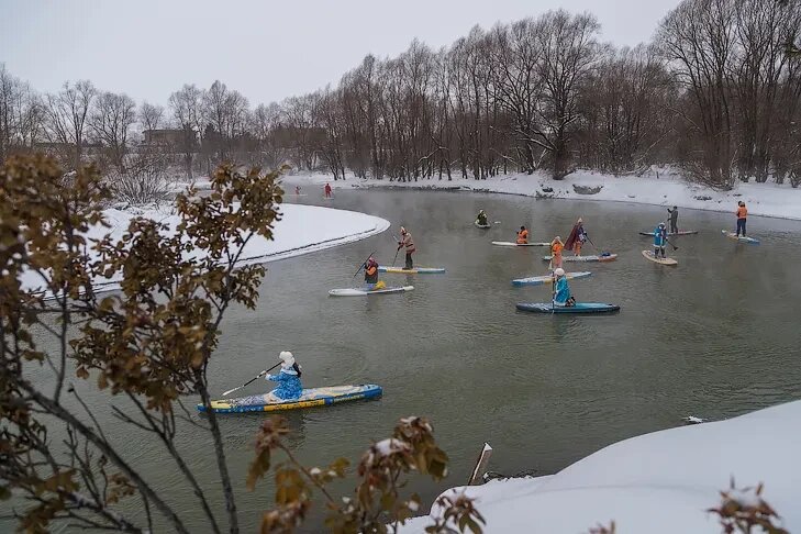 Фото Андрея Заржецкого Новосибирцы в костюмах и на сапбордах провели новогодний заплыв по протоке Оби рядом с Новомарусино. Это уже седьмая по счёту акция, которая привлекает внимание своей оригинальностью и красочностью. Новосибирцы в костюмах и на сапбордах провели новогодний заплыв по протоке Оби рядом с Новомарусино. Это уже седьмая по счёту акция, которая привлекает внимание своей оригинальностью и красочностью. Даже в мороз, когда температура опустилась до -20 градусов, сапбордисты не отказались от своего мероприятия. Они собрались в конце декабря на незамерзающей части реки, чтобы устроить яркое и весёлое действо. Традиционно, в последнюю субботу декабря, любители сапбордов устраивают костюмированный заплыв, чтобы создать праздничное настроение и привлечь внимание к здоровому образу жизни. В этом году среди участников были богатыри, князья, ослик, несколько снегурочек и популярный кот Матроскин. Однако ни один Дед Мороз с веслом не присоединился к заплыву. Каждый год костюмы мен