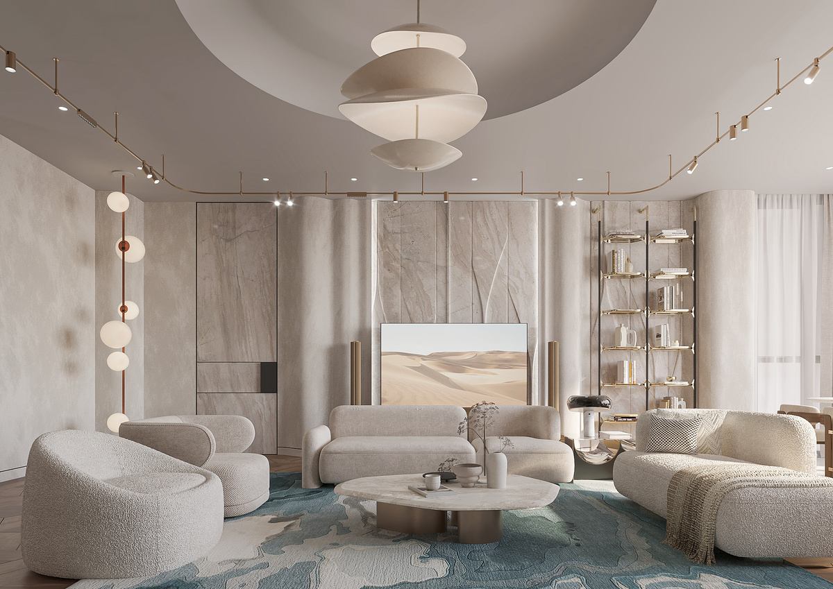 Зачастую современный дизайн кажется слишком холодным или «выставочным». В новом проекте Futuris Architects Russia мы поставили перед собой цель доказать: минимализм может быть уютным, мягким и по-настоящему домашним. Гостиная гармонично сочетает в себе современную элегантность с мягким минимализмом, характеризующимся органическими формами и нейтральными тонами. Мягкие, изогнутые сиденья из ткани букле цвета слоновой кости создают уютную, но изысканную атмосферу. Расположение мебели способствует интимным беседам, сохраняя при этом ощущение открытости. Яркий ковер в оттенках синего и бежевого имитирует текучесть воды, добавляя пространству естественный, успокаивающий элемент. Столовая