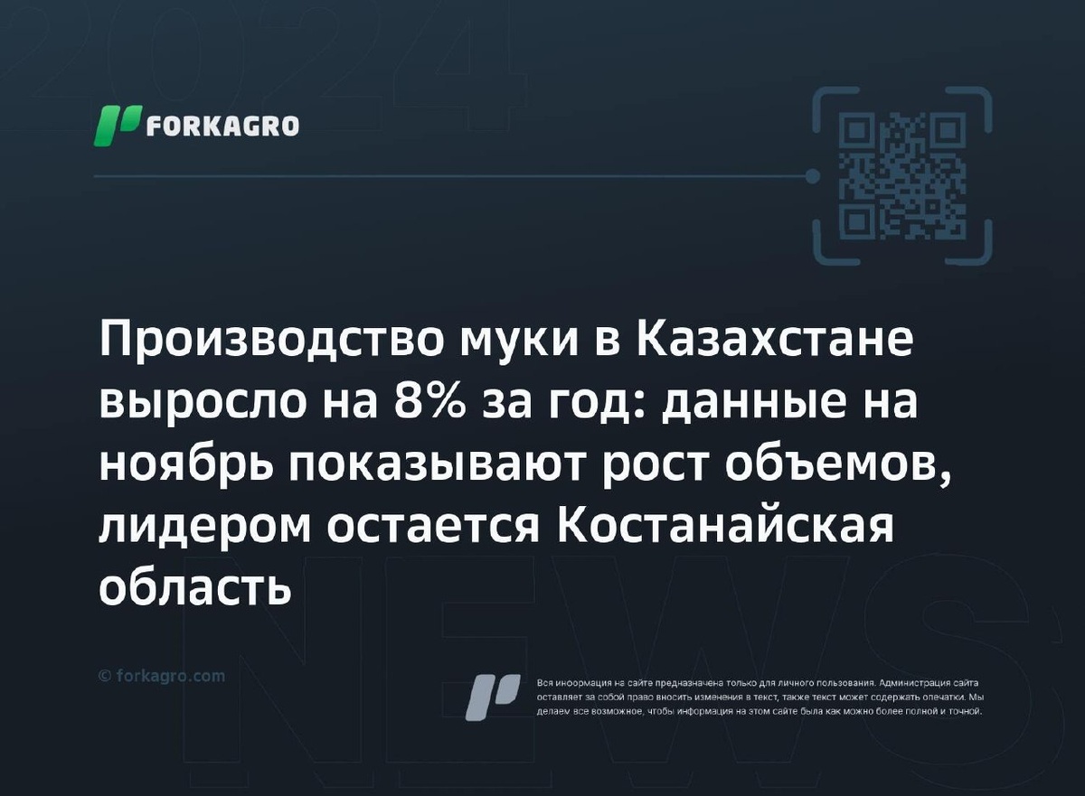 В Казахстане за 11 месяцев 2025 года произведено около 3 млн тонн пшеничной муки, превышая прошлогодние показатели на 8%. Лидерами производства остаются Костанайская область, Северо-Казахстанская область и г. Шымкент. Казахстанские производители получили в ноябре 346,3 тыс. тонн муки. Подробную статистику доступно по ссылке. Перейти к источнику