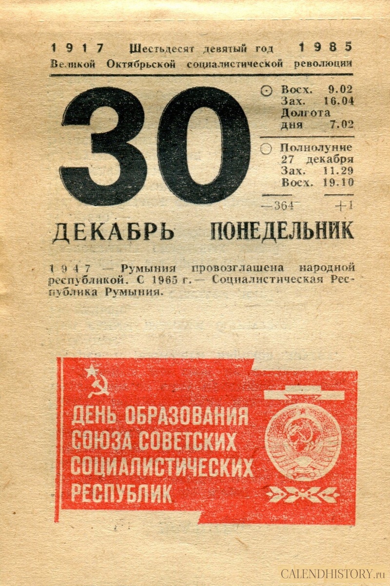 30 декабря 1985-го года — Календарь Политиздата 1947 — Румыния провозглашена народной республикой. С 1965 г. Социалистическая Республика Румыния. ДЕНЬ ОБРАЗОВАНИЯ СОЮЗА СОВЕТСКИХ СОЦИАЛИСТИЧЕСКИХ РЕСПУБЛИК Больше старых советских отрывных календарей смотрите у нас на сайте - calendhistory.ru https://calendhistory.ru/30-dekabrja-1985-go-goda-kalendar-politizdata/