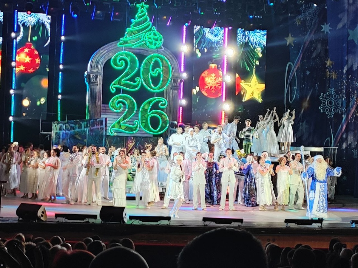 С такой шуточной просьбой обратился к зрителям Музыкального театра Дед Мороз в конце концертного представления «Мелодии новогодней ночи». Такой концерт стал давно традиционным для нашего театра. Для детей утренники, а для взрослых, получается, вечерники. «Щелкунчик» само собой - тоже идёт в нашем театре, а здесь задействовано много артистов и создаётся предновогоднее настроение. В этом году мы решили изменить давней традиции: прежде каждый год 31 декабря ходили на «Щелкунчика». На «Мелодиях» тоже бывали не раз, но тут вот решили ограничиться. К тому же недавно двух «Щелкунчиков» уже посмотрели (Ростовчанам показали нуреевского “Щелкунчика” и прямую трансляцию “Щелкунчика” из “Стасика”). Чем отличался нынешний предновогодний концертный вечер от тех, что были в прежние годы? Ну, во-первых, с годами растёт мастерство и оперной, и балетной трупп. Появились чудесные, сильные голоса, прекрасные балерины и танцовщики. Поразили потрясающие динамичные декорации, органично включающие экранные п