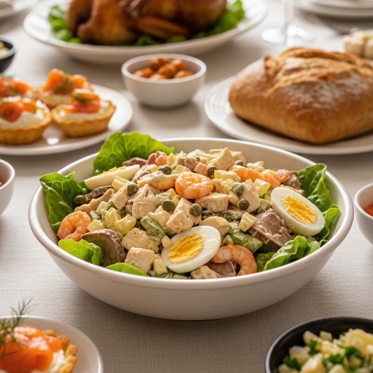 А что бы такое сейчас смог соорудить мсье Оливье вместо привычного нам "русского" картофельного салата? С учётом нынешних-то цен? Попробуем справиться сами. Если уж не кулинарный шедевр создадим, то хотя бы с оттенком того самого вкуса «дореволюционной респектабельности». Продукты для нашего Оливье Итак, колбасу мы исключаем по политическим не только по вкусовым соображениям, а ещё как совершенно неполезный продукт. Рябчиков заменим перепёлкой — 2–3 шт. или куриным бедром без кожи — 2 шт. (бедро вкуснее грудки и более сочное). Вместо раковых шеек — креветки — 300 г (лучше крупные) Говяжий язык — вообще не проблема, 1 небольшой. Яйца — 3 шт. Дополнение — кислинка: Корнишоны — 3–4 шт. Каперсы — 1–1,5 ст. л. Листья салата (романо / айсберг) Без чёрной икры как-нибудь обойдёмся. 🤩 Готовим основу Язык Отварить 2–2,5 часа с лаврушкой, перцем горошком, луком. Сразу после — в холодную воду, снять кожу. Нарезать небольшими кубиками (5-7 мм). Птицу Отварить или запечь при 180° до готовн