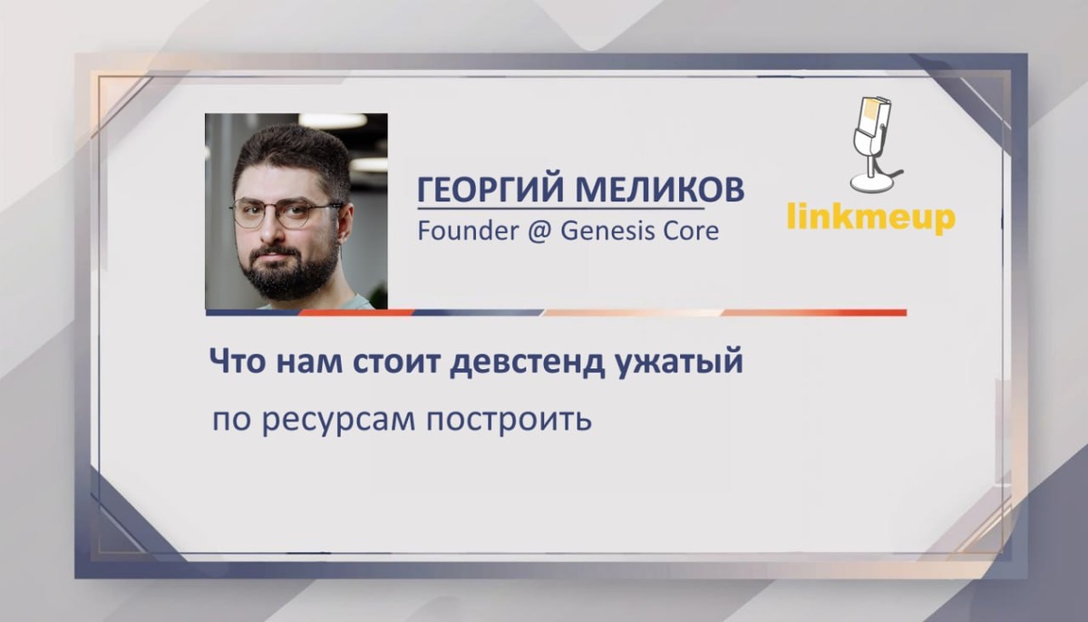 ? А что происходит, поняли? Если не особо, то Георгий Меликов в своём докладе на линкмитапе как раз будет рассказывать о том, как собрать сложный стенд в один понятный образ, страшно всё ужать, и чтобы по ресурсам получилось как два пакета гречки. Если премию уже выдали, то лучшего приложения, кроме как купить билет, точно не придумаете: https://linkmeetup.ru/#tickets А доклады, принятые в программу, здесь: https://linkmeetup.ru/ovbdoklady Скоро уже покажем расписание целиком.