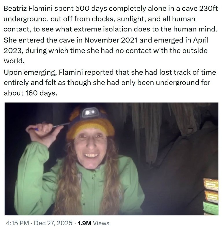 В ноябре 2021 года испанку Беатрис Фламини опустили в пещеру на глубине 70 метров и оставили там одну. Она ставила над собой эксперимент – как долго сможет продержаться в полной изоляции и не сойти с ума. Ученые за ней следили, но в контакт не вступали. Еду ей доставляли в условленное место.