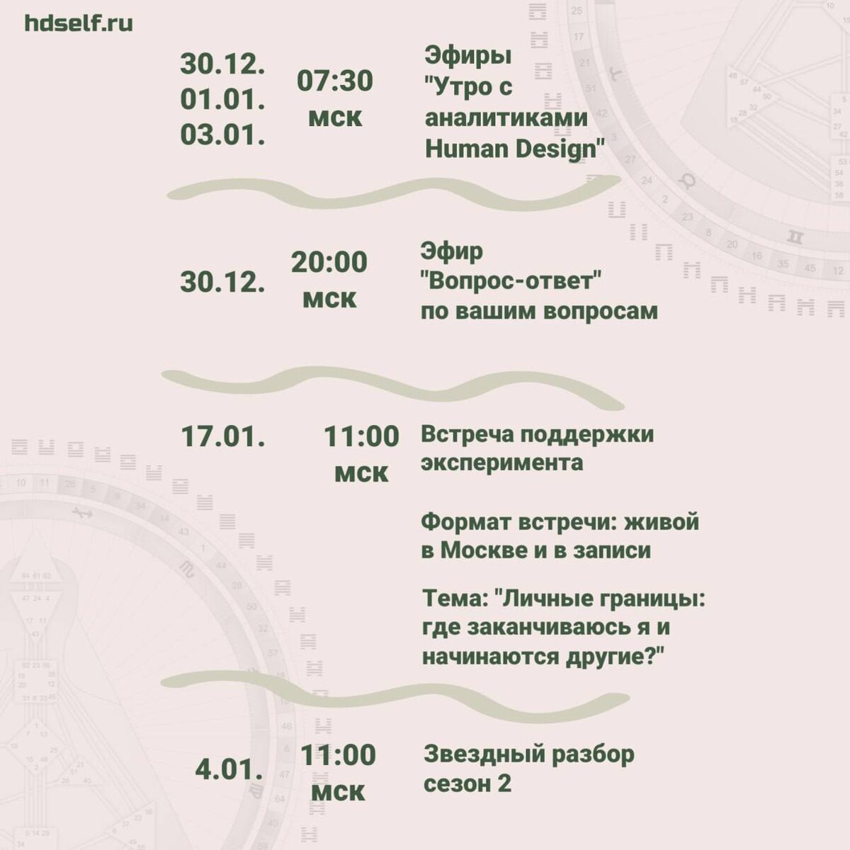 ▫️30.12., 01.01. и 03.01 в 07:30 МСК в сети Clubhouse "Утро с аналитиками Дизайн Человека" Тема недели "Что поможет определить, почему свои желания сложно заметить?" ▫️30.12. в 20:00 МСК Эфир ВКОНТАКТЕ "Вопрос-ответ" Присылайте вопросы заранее личным сообщением или анонимно по ссылке. ▫️04.01. в 11:00 МСК Эфир ВКОНТАКТЕ "Звездный разбор" Разберем дизайн известной личности. Сохраните себе расписание, перешлите друзьям. И присоединяйтесь) #hdselfru_информационное