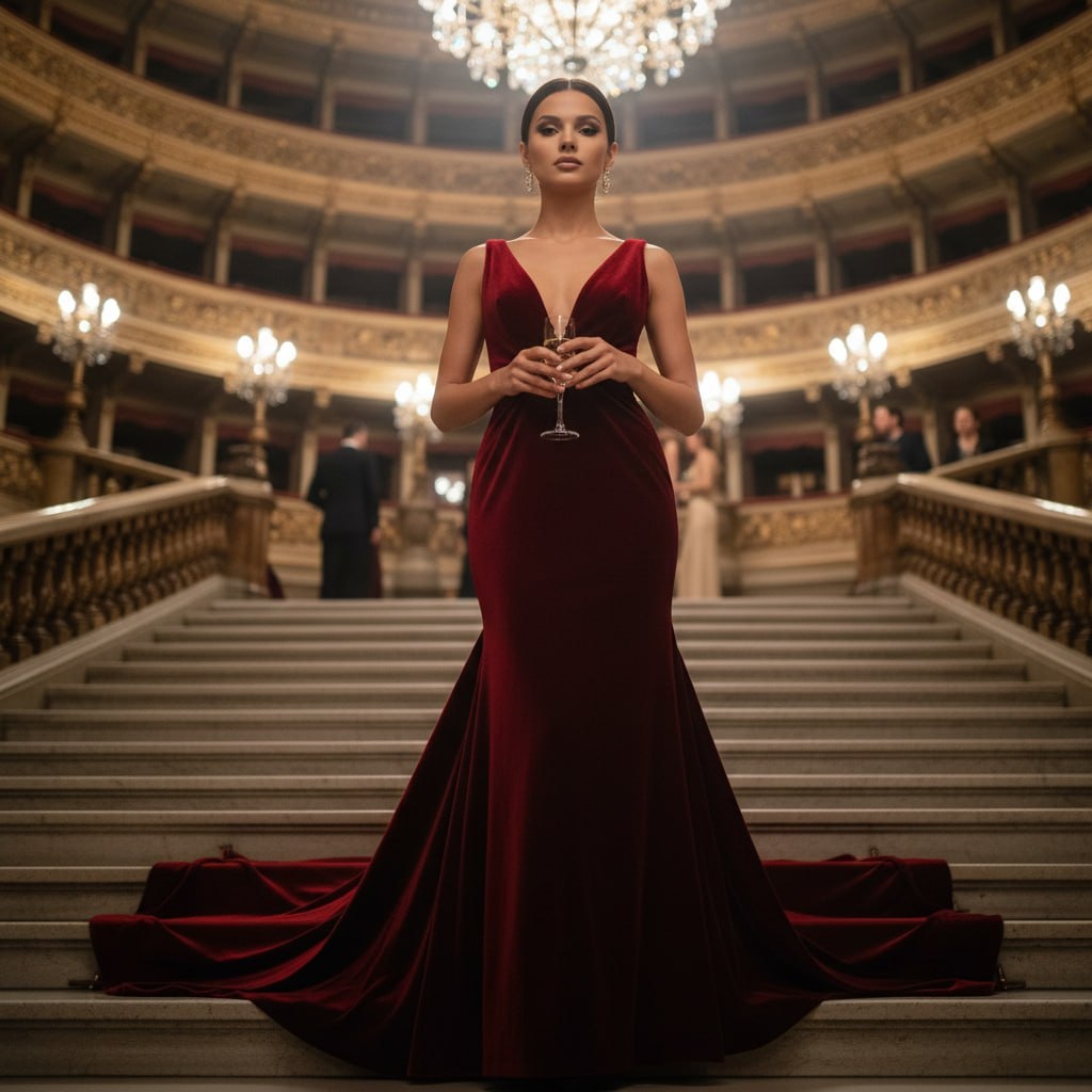 🔥 Хочешь кадры, как из финала голливудского фильма? Где ты — главная звезда вечера, вокруг огни, а образ выглядит на миллион. Закидываем селфи в бот, берем этот промпт и идем покорять ленту. ⚡️ Используя загруженное селфи как точный референс лица с полным сохранением всех черт и идентичности на 100%, создай фотографию по описанию, сохраняя абсолютное сходство лица. [Кинематографичный редакционный портрет] женщины на [грандиозном балу в старинном оперном театре]. Она [стоит на широкой мраморной лестнице, слегка повернувшись к камере]. Одета в [роскошное вечернее платье в пол из темно-красного бархата с глубоким вырезом и длинным шлейфом]. В руках [тонкий бокал с искрящимся шампанским]. [Драматичное освещение софитов], создающее мягкие блики на лице и ткани. На фоне — [размытые огни огромных хрустальных люстр и золотой декор]. [Средний план, ракурс снизу вверх]. Высокая мода, фотореалистично, 8K, объектив 85мм, малая глубина резкости. Как менять: 👀 🎯 Ракурс (замени [средний план,