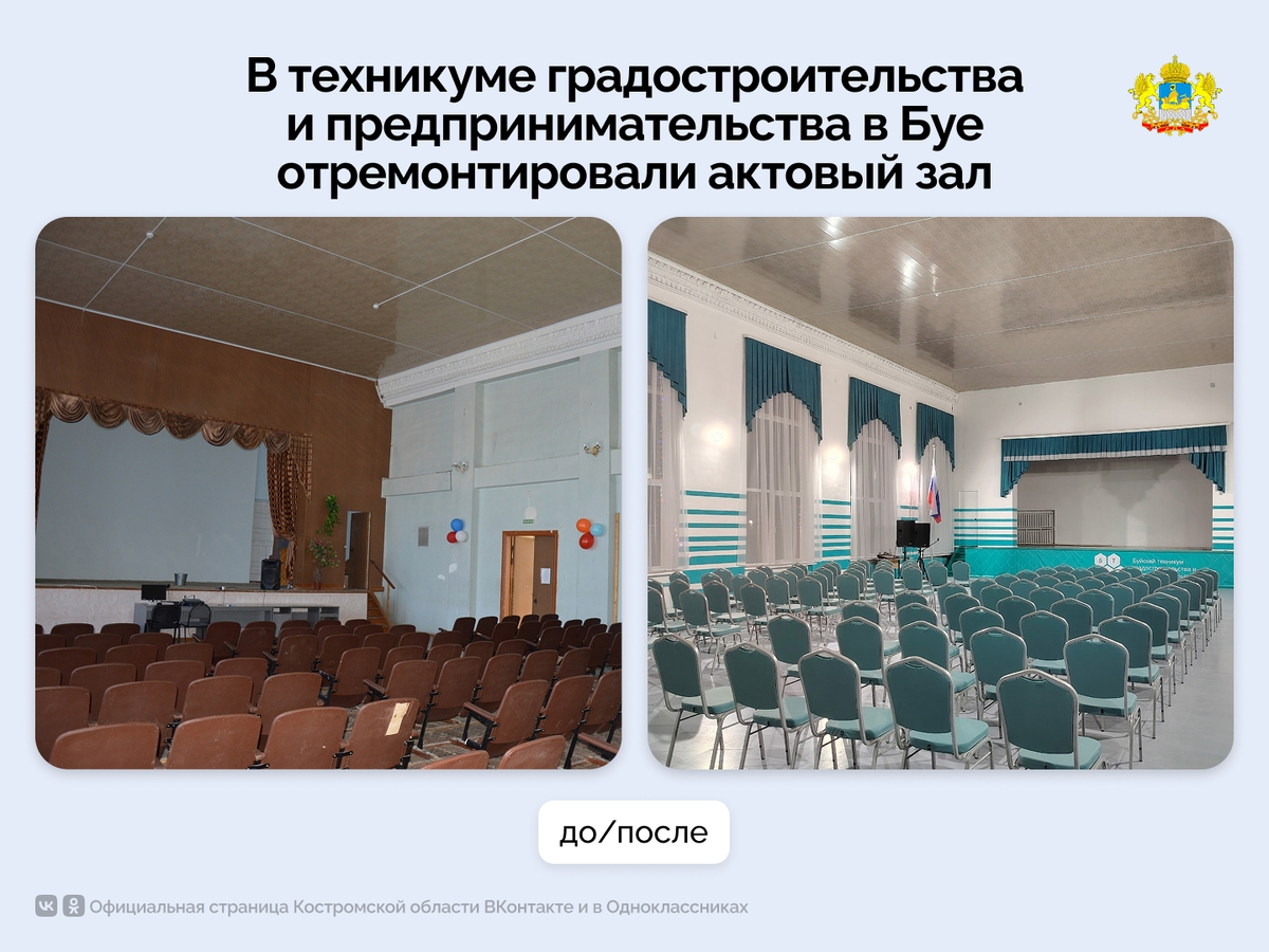 Работы заняли почти полгода. В июле студенты-стройотрядовцы и преподаватели выровняли полы в зале. С сентября по конец ноября учащиеся выполняли косметический ремонт: штукатурили и шпатлевали стены, красили и покрывали их лаком. Интерьер дополнили изящной мебелью, шторами и оформлением сцены в тон. #КостромскаяОбласть #Образование