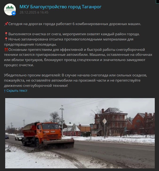Ситуация на дорогах Таганрога остаётся напряжённой. Жители недовольны состоянием дорог после снегопада. Камбулова срочно включает антикризис. На подконтрольных каналах появляется информация: шесть комбинированных дорожных машин чистят от снега каждый район города. Глава города заявляет: город убирается. Однако сегодня в 8:00 утра наши читатели прислали фотографии «убранных» дорог. Контрольная точка — перекрёсток Дзержинского и Морозова. Со вчерашнего дня обстановка не изменилась. Дорога по-прежнему скользкая. Судя по фотографиям, уборка носит формальный характер. Скорее всего, только на бумаге. История повторяется? Интересный факт из истории города. Последний мэр Таганрога отправился в места не столь отдалённые как раз из-за схемы: по бумагам город чистили, по факту был засыпан снегом. Напомним: в 2014 году после чрезвычайной ситуации экс-мэр Прасолов незаконно выделил из резервного фонда более 5,6 млн рублей на оплату работ знакомому. Экспертиза показала: фактически работы выпол