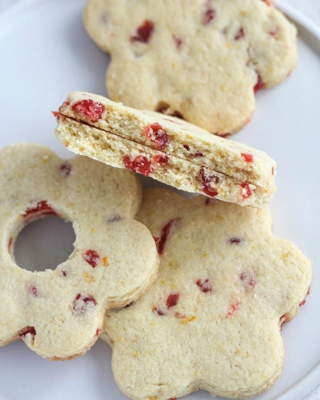 🍒🍪 Ингредиенты: 150г сливочного масла 82,5% 100г сахара 10г ванильного сахара 1 яйцо Цедра одного апельсина 250г пшеничной муки в/с 100г миндальной муки 4г разрыхлителя 80г вяленой вишни/клюквы Мягкое сливочное масло взбиваем с сахаром до пышной консистенции и побеления. Далее добавляем яйцо, взбиваем массу на низкой скорости миксера до однородности. Добавляем цедру апельсина, перемешиваем. Добавляем сухие ингредиенты: пшеничную муку, миндальную и разрыхлитель. Тщательно размешиваем тесто на низкой скорости миксера. В конце добавляем вяленую вишню и вмешиваем в тесто с помощью силиконовой лопатки. Вишню предварительно нужно измельчить на небольшие кусочки. Тесто кладем в целлофановый пакет и убраем в холодильник на 1-1,5 часа. Раскатываем тесто толщиной 8-10 мм, удобно это делать через лист пергамента. Излишки теста убираем и отправляем печенье в разогретую до 160 духовку примерно на 12-15 минут. Печенье должно слегка зарумяниться.