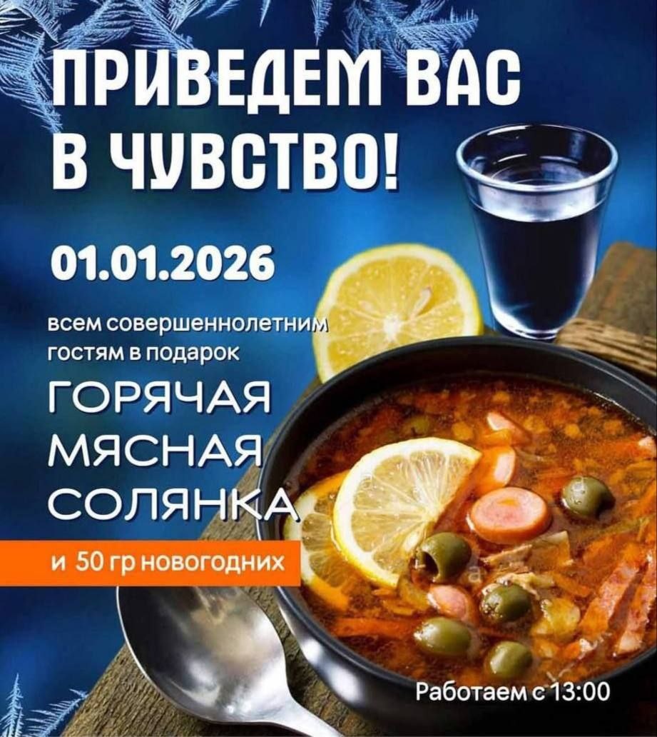 Гостей заведения бесплатно угостят солянкой и нальют 50 г.