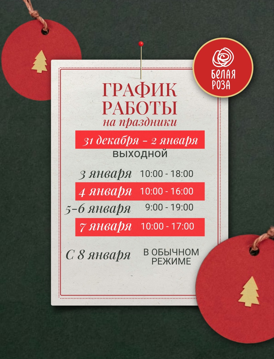 » на Елизаровых 93✨ Чтобы вы легко спланировали свои покупки к Новому году — сохраняйте расписание 👇 📌 31.12.25 - 02.01.26 ВЫХОДНОЙ 🕰 Рабочие дни в праздники: 03.01.26 - с 10:00 до 18:00 04.01.26 — с 10:00 до 16:00 05–06.01.26 - с 09:00 до 19:00 07.01.26 - с 10:00 до 17:00 ❄️ С 08.01.26 работаем В ОБЫЧНОМ РЕЖИМЕ Планируйте визит заранее и приходите за вдохновением, тканями и уютом в «Белую Розу» 🤍 Всегда рады вам! 🎁🧵