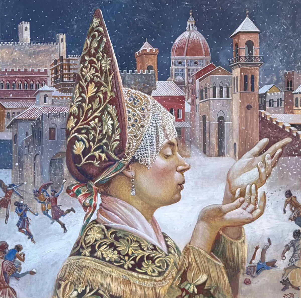 46х46 холст/темпера 2025 ••• На картине Дмитрия Краснова «Забава» изображена русская купчиха, что привезла снег во Флоренцию, и превратила знаменитый город в пространство игры. Фоном становится архитектура, напоминающая полотна Джотто и мастеров итальянского Проторенессанса. Контраст морозной русской сказки и теплой тосканской земли создает эффект культурного чуда. Краснов продолжает тему народных гуляний, сохраняя точность жестов и радостную насыщенность сцены. ••• Отдать дань почтения средневековому кватроченто, можно на выставке «Реверанс эпохе Возрождения» до 10 января 2026. ••• Москва, Ходынский бульвар 20а, с 11:00 до 21:00 ежедневно. Выставка бесплатная, работы продаются. Вся контактная информация на сайте YOLKA.art