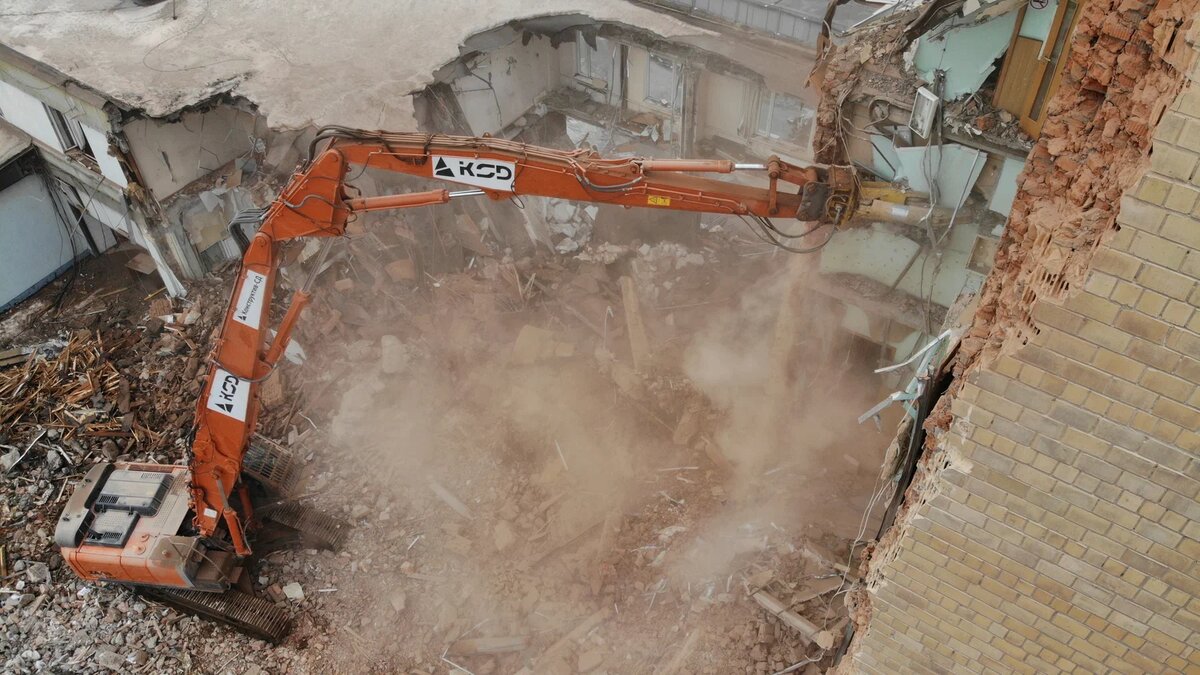 Экскаватор работает поэтапно, разрушая отдельные участки конструкции и не допуская одновременного ослабления нескольких несущих элементов. Такой подход позволяет контролировать перераспределение нагрузок.
