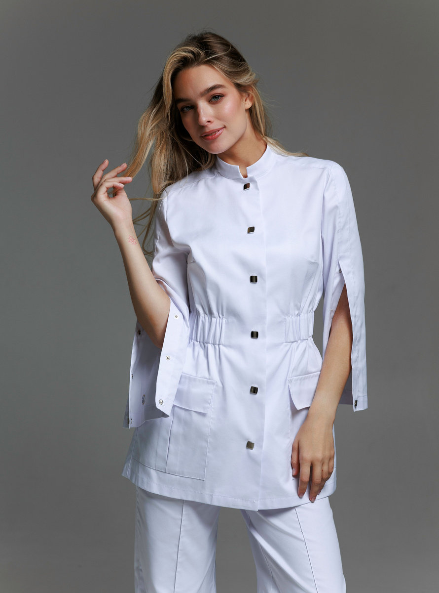 Современная медицинская одежда больше не про «надо». Она — про «хочу». Про свободу движений, уверенность в себе и эстетику, которая остаётся с вами весь день. Этот медицинский жакет Mariita — именно такой. Он выполнен в современном лаконичном стиле и сочетает в себе функциональность и аккуратный силуэт. Модель подходит для повседневной работы в клинике, медицинском центре или косметологическом кабинете, сохраняя аккуратный внешний вид в течение дня. Жакет имеет прямой силуэт с эластичной резинкой на поясе. Внутренние фиксаторы позволяют регулировать степень прилегания, адаптируя посадку под индивидуальные особенности фигуры. Благодаря этому жакет можно носить как более свободно, так и с подчёркнутой линией талии. Минималистичный воротник-стойка придаёт образу собранность и профессиональную строгость, сохраняя при этом мягкость и женственность.