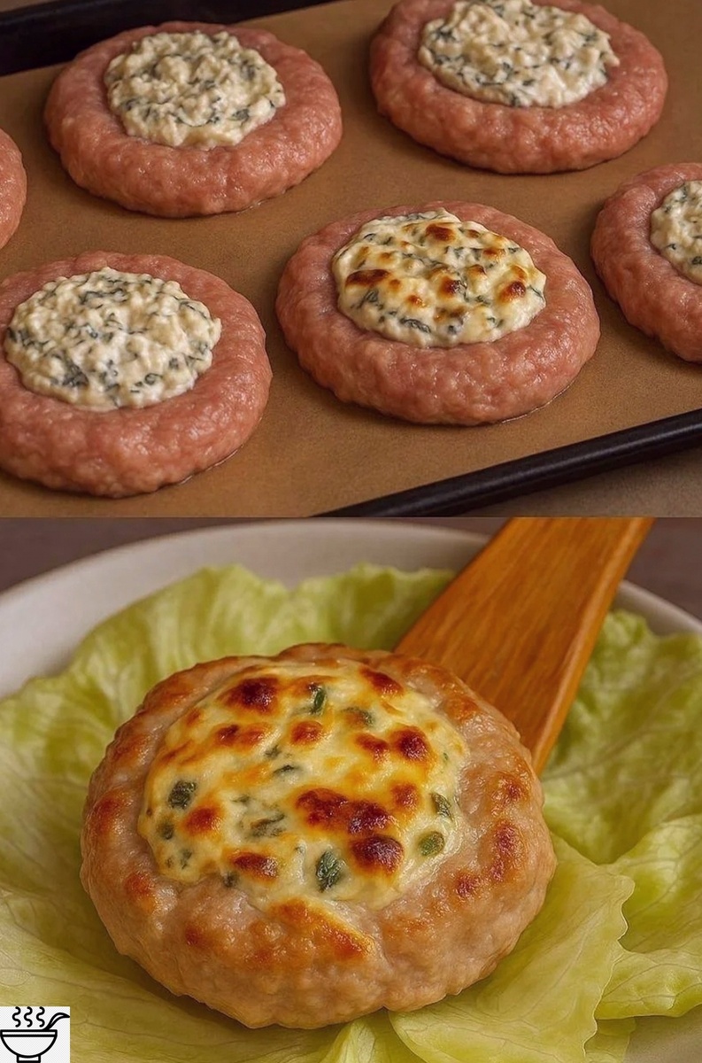 4. Выложить нaчинку в углублeния котлeт. Зaпeкaть пpи 180 °C около 35 минут до pумяной коpочки.