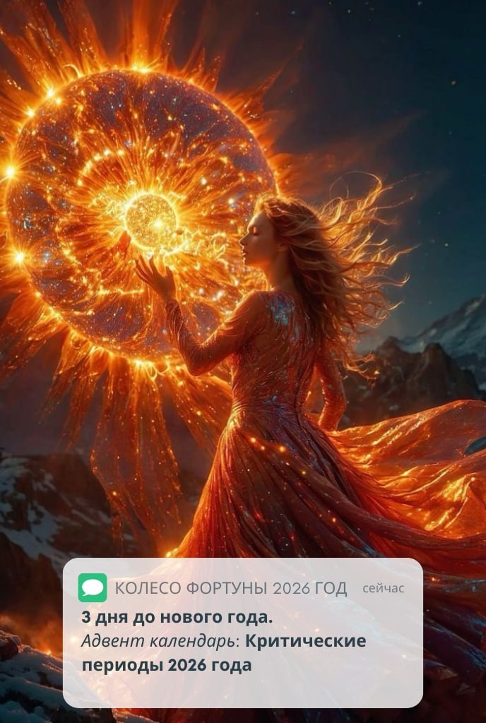 ! Продолжение "Адвент календаря" на 2026 год Критические периоды 2026 года (когда Колесо крутится быстрее): Март Не завершенные истории с деньгами могут еще на дольше затянуться, если в этом месяце не сосредоточиться на их завершении. В этом месяце лучше всего закрывать кредиты, отдавать долги, и выполнить все давно тянущиеся обещания с деньгами. Апрель Неожиданный поворот в карьере или финансах. Будьте готовы к резким изменениям, неожиданным встречам, или спонтанным переговорам которые были не запланированы. Август Судьбоносные встречи или расставания. Вопросы кармы и равновесия в отношениях. Луше езжайте в отпуск в этот месяц - честное слово)) Устраивайте романтические вечера и сюрпризы. Старайтесь обходить "острые углы в отношениях". Декабрь Завершение цикла, подведение итогов года. Возможность «начать с чистого листа». Внезапное завершение чего-то. ❤️❤️❤️❤️❤️❤️❤️❤️❤️❤️ Заботливо 🩷 напоминаю что осталось 3 дня до того как вы можете заказать свою личную прогностику на 2026 г