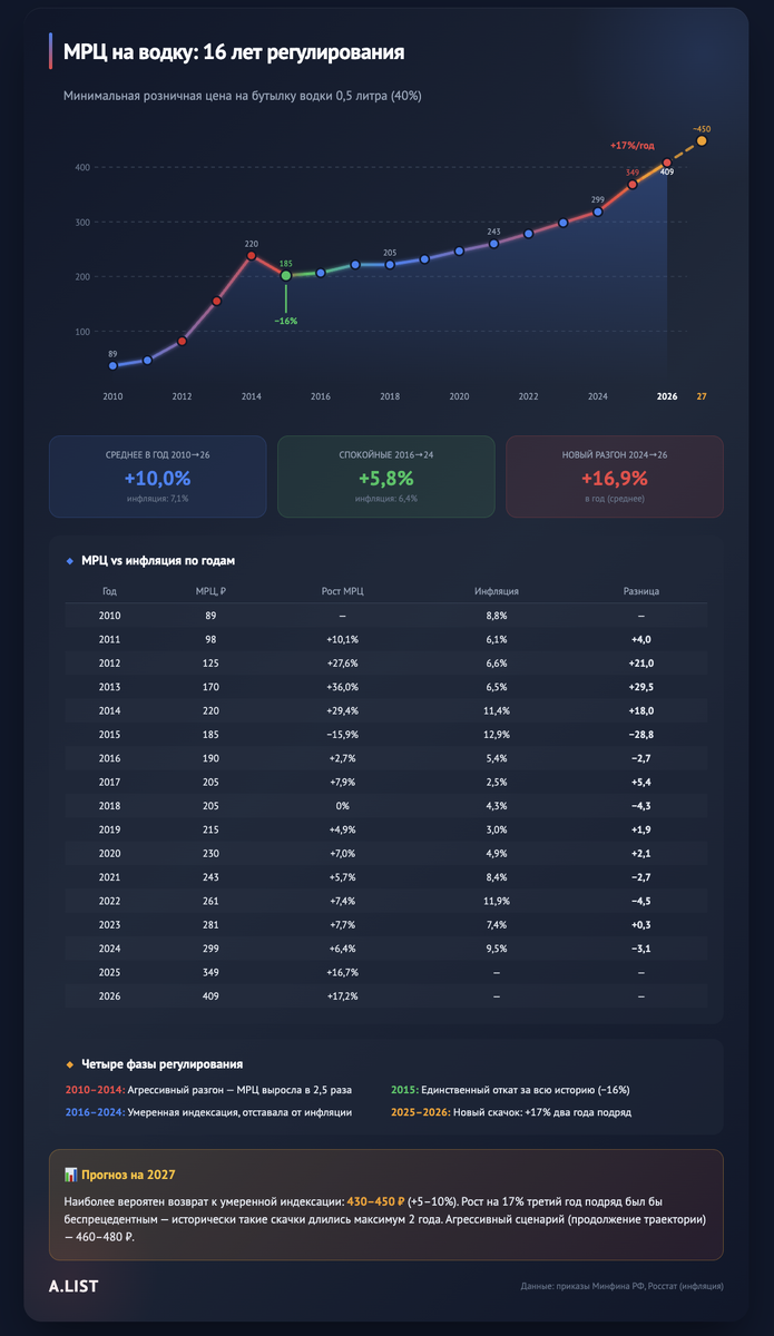 МРЦ в 409 рублей с 2026 года выглядит шокирующе. Но проблема не в самой цифре — алкоголь проигрывает конкуренцию за то, что осталось от зарплаты после обязательных расходов. Формально статистика благостная: средняя зарплата за 16 лет выросла в 5 с лишним раз, водка — «всего» в 4,6. Мы только что прошли исторический пик доступности в 2024 году. Казалось бы, живём лучше и веселее. Но на кассе 400+ рублей за бутылку ощущаются совсем иначе. Ловушка средней температуры. «Средняя зарплата» — цифра лукавая. Медианная (та, которую получает большинство) почти вдвое ниже. Если считать индекс доступности не по отчётам, а по реальным кошелькам, он сразу сдувается. Битва за свободный рубль. Главный враг алкоголя — не акциз, а обязательные расходы. Из зарплаты нужно вычесть то, что нельзя не заплатить: коммуналку, аренду, ипотеку, учебу, еду. И тут даже официальная статистика начинает кусаться. Говядина с 2010 года подорожала в 3,8 раза, молоко — втрое, сливочное масло — в 4,8 раза (обогнав даже вод