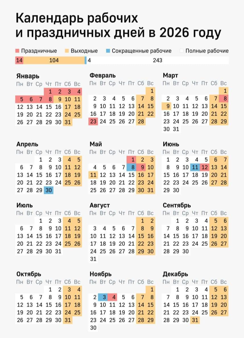 Рабочий календарь на 2026 год сформирован без шестидневных рабочих недель. При этом в 2027 году график изменится — ожидается появление одной шестидневки.