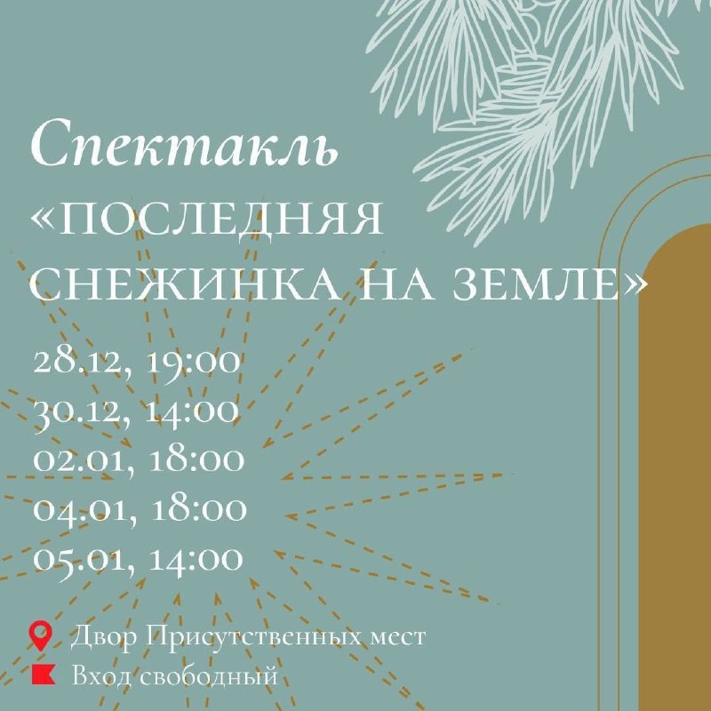 + 🗓️ 30 декабря , 2,4,5 января ⏰ 14:00 💸 бесплатно 🏫 Казанский Кремль 📍 Двор Присутственных мест ⭐️В бескрайнем зимнем мире четыре клоуна живут в радостной суете: катаются с горок, лепят снеговиков, шутят со зрителями. И вдруг один из них замечает на своей варежке особенную снежинку — она сияет мягким светом, переливается всеми оттенками голубого и серебра, и кажется, что в ней заключена музыка, воспоминания и радость всего мира. Они решают, что эта снежинка — последняя, и ее нужно сохранить любой ценой. Не потому что снег исчезнет, а потому что эта одна — неповторимая и живая ➡️ ПОДРОБНОСТИ ⬅️ ❗️ Детская Афиша | Казань Больше информации в нашей группе, переходите