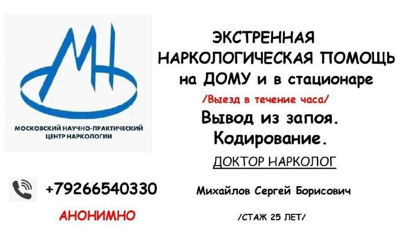 ? Знаем, кому доверять. Доктор Михайлов Сергей Борисович. 👉Вывод из запоя и облегчение состояния. 👉Консультация и диагностика. 👉Кодирование и подбор метода лечения. 👉Подбор стационара или реабилитационного центра. 👉Работает деликатно и профессионально. Поможет найти адекватное решение. Начните с консультации: +79266540330 Сергей Борисович
