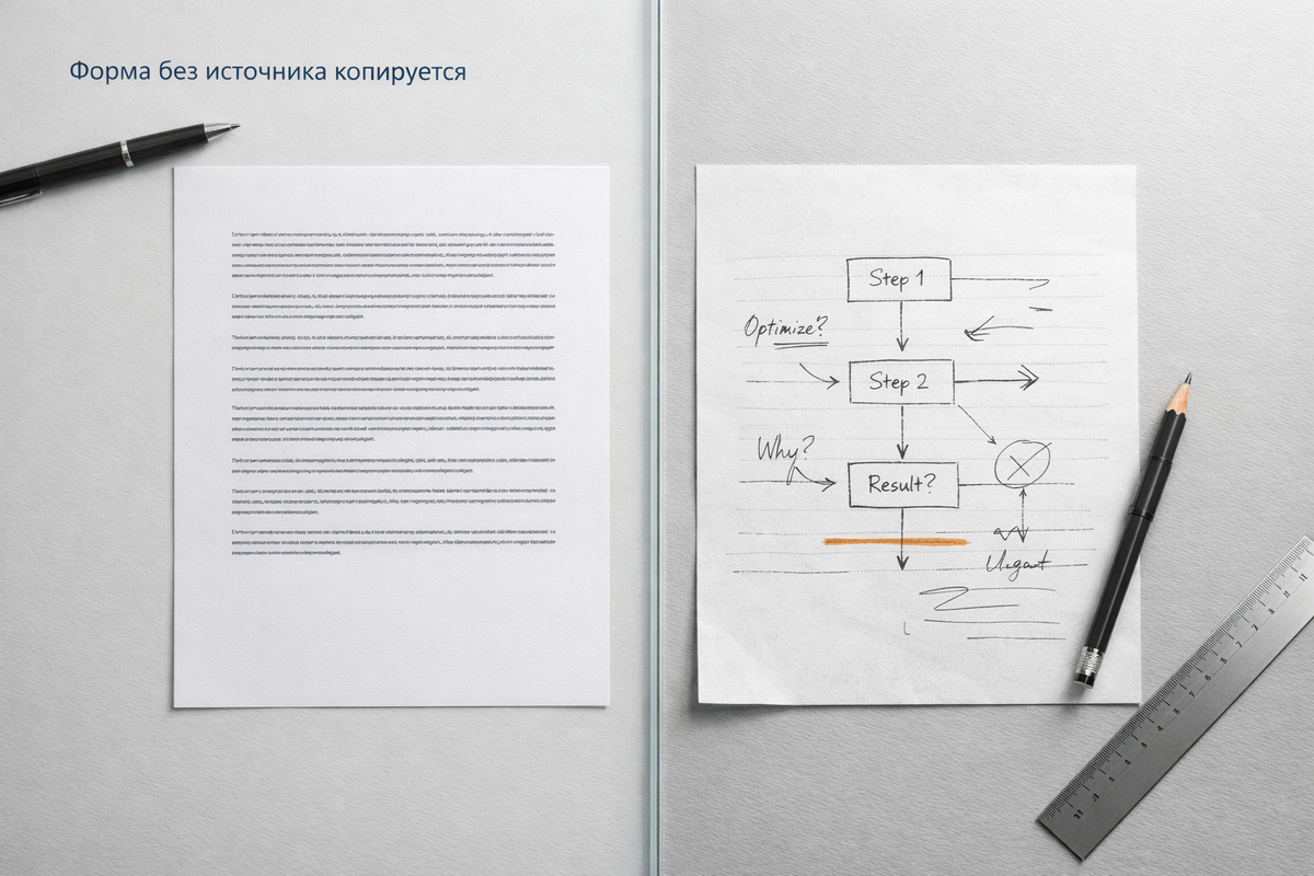 Копирование в этой точке – не «грех» и не «недостаток смелости». Это симптом того, что у тебя нет собственных правил выбора. Ты не можешь производить мысль изнутри своей системы, поэтому перерабатываешь то, что уже упаковано рынком. Курсы, шаблоны, нейросети в такой ситуации обычно не помогают, а усиливают серость. Они дают ещё больше готовых формулировок, то есть добавляют материалов для переработки, но не создают источник.